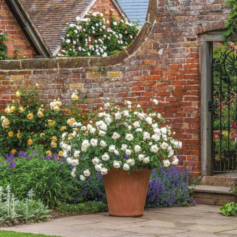 Austinroser plantes bedst gruppevis i rosenbede med en planteafstand af 40 cm. Moderat beskæring anbefales.