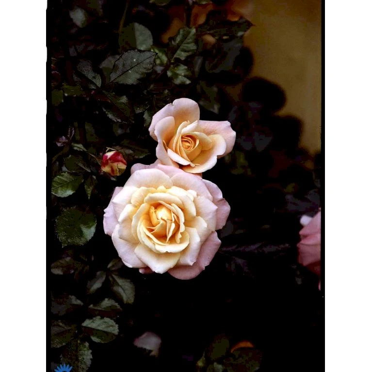 Flere nuancer af sart abrikos. Middelstor til stor halvfyldt blomst med let eller ingen duft.