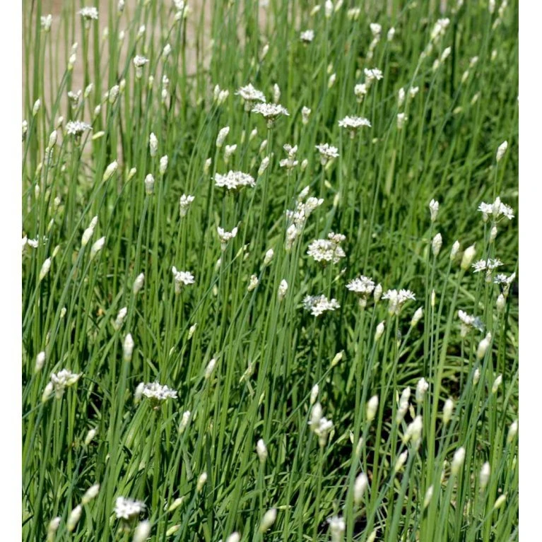 juli til september. Blomsterne er skærme af mange små, hvide stjerneformede blomster, dekorative og spiselige. Smager ligesom bladene af hvidløg. Blomsterne søges af bier og sommerfugle.