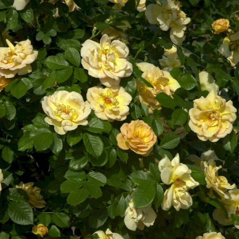 Busket og klatrende vækstform, roserne sidder undertiden enkeltvis, typisk 3 – 7 stykker sammen.