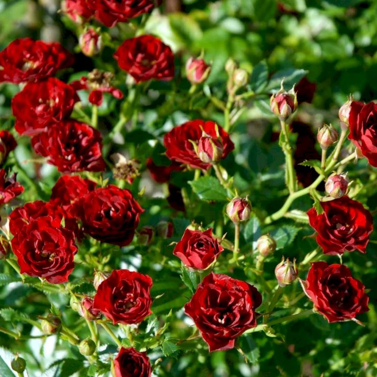 Rent røde, halvfyldte blomster med let duft. 10-25 kronblade. 5-7 cm i diameter.
