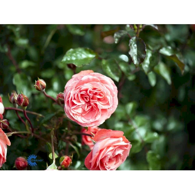 Meget smuk nuance af koralrosa. Middelstor og velfyldt blomst med let duft. 20-40 kronblade. 7-9 cm i diameter.